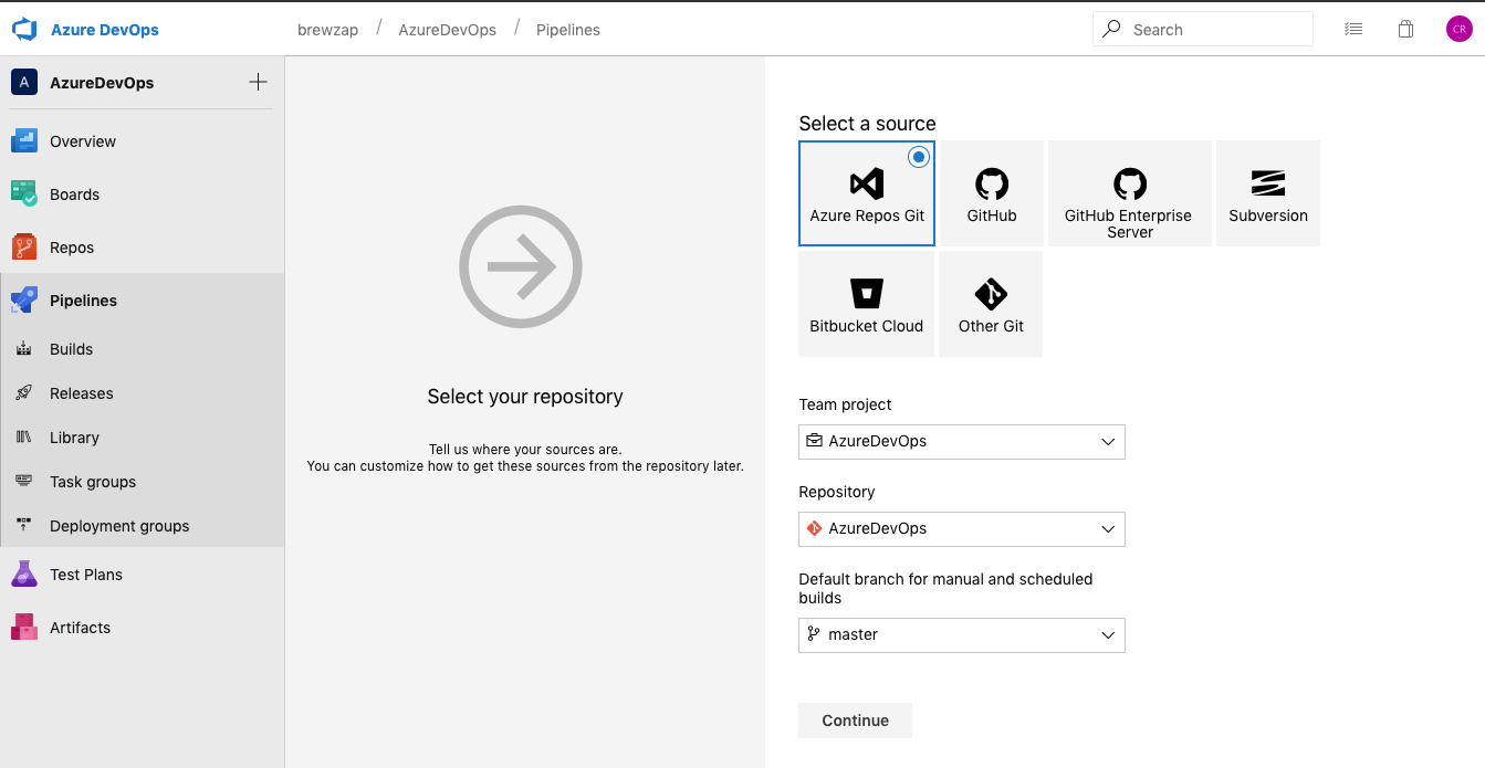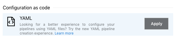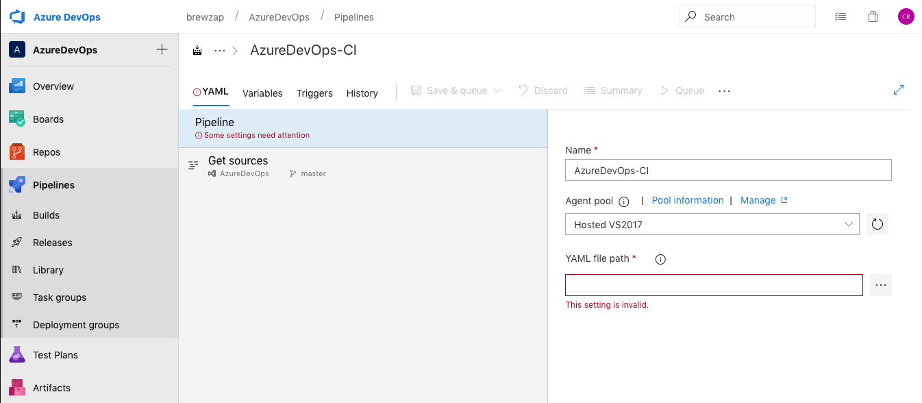 Now you need to specify the path to your YAML file. This is the path in source control though not a local path. To select it, you will need to have pushed a copy of your code to the remote master.