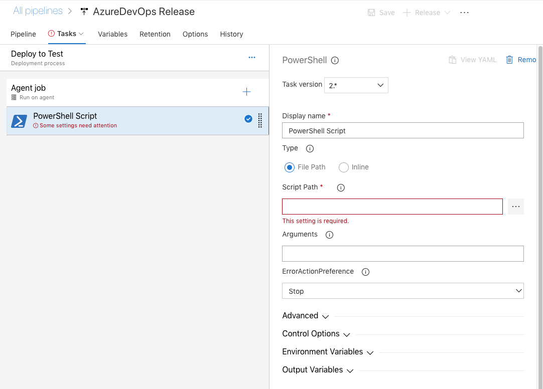 Back to configuring our PowerShell task. For Type specify File Path. We have to get this file from the published artifacts. That’s why we added a Copy Files task to our YAML for it.