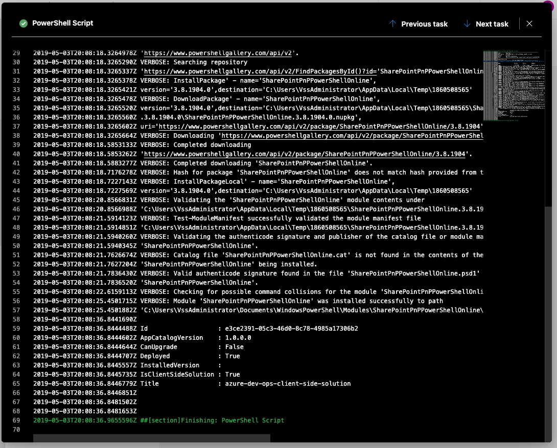 If all goes well, you won’t get any errors in your script. Here is the output from mine after deployment.