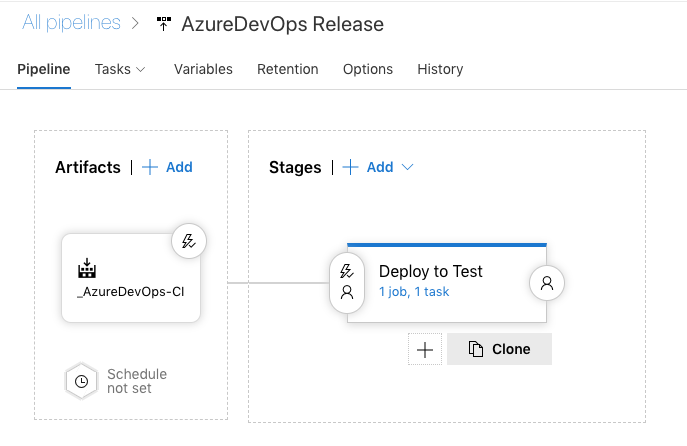 You might want to set up another stage for another environment like production. This can be manually triggered but eventually you could tie it to testing criteria and approval if you wanted. However over your Stage and select Clone.